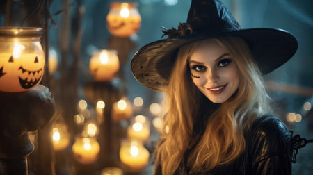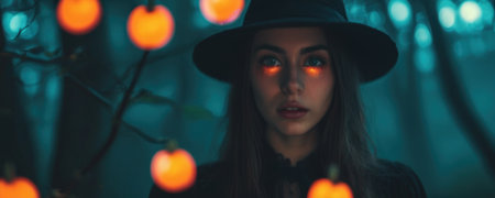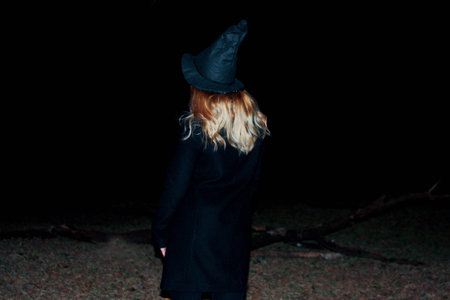 Woman with witch hat surrounded by bokeh lights in a magical forest. Concept of Halloween, fantasy, mystery, enchanted forest.