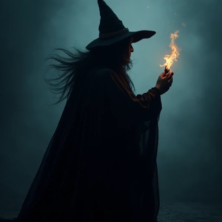 A mysterious witch conducts a magical ritual in her dimly lit, enchanting workshop