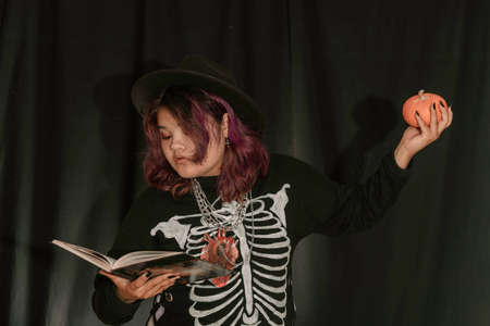 Young Asian woman in costume witch and hold pumpkin and book on black cloth background of Halloween. Portrait of teen dressed up as witch for celebrate Halloween.