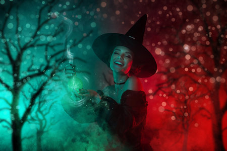 Smiling young woman portrays a witch for halloween in the studio. Celebration on October 31st.