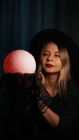 A young woman fortune teller in a hat is holding a magic ball. Beautiful psychic woman is guessing with a red magic ball