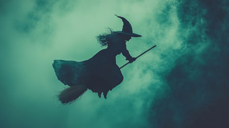 witch glides gracefully on her broomstick across a dramatic night sky filled with swirling clouds embodying the essence of Halloween magic and mystique.