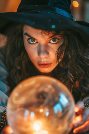 Mystical Young Woman in Witch Costume Gazing Intently into Crystal Ball with Ambient Lighting AI Generative