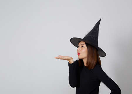 Beautiful asian woman wearing witch costume for Halloween party