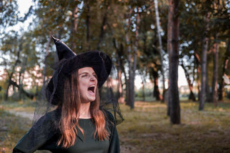 Pretty young beautiful woman in dark dress and witch hat standing in the middle of the autumn woods or park. Halloween party costume. Close-up portrait. Shadow on her face.