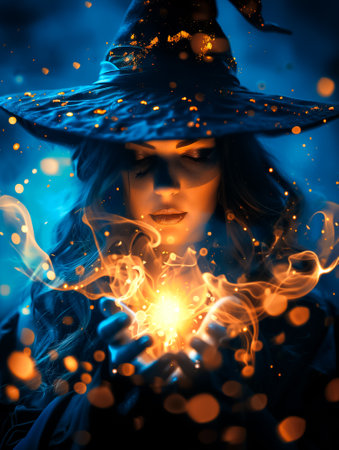 A witch in a pointed hat conjures glowing orbs from her hands, surrounded by swirling smoke and enchanting sparkles in a mystical Halloween atmosphere.