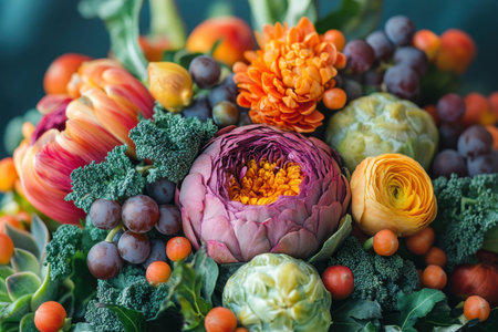 A vibrant assortment of fresh fruits and vegetables showcases a kaleidoscope of colors and textures. Brightly colored flowers and greens mingle with grapes and unique edible plants, creating a lively atmosphere full of seasonal bounty.