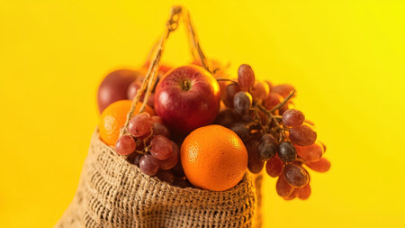 A woven bag overflowing with red apples oranges and purple grapes against a bright yellow backdrop.