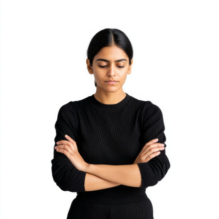A confident young woman wearing black clothing poses with her arms crossed. Her thoughtful expression against a white background conveys strength and determination.