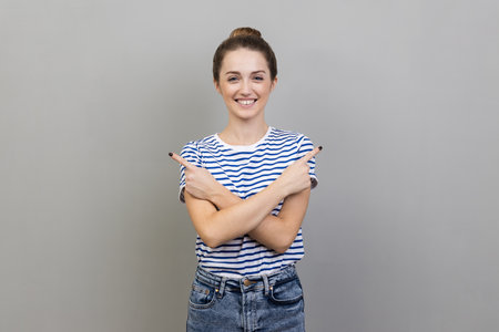 Portrait of satisfied woman wearing striped T-shirt pointing both sides, showing blank copy space for idea presentation, commercial text, toothy smile. Indoor studio shot isolated on gray background.