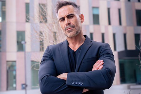 A man with his arms crossed is standing confidently in front of a building. He appears to be observing his surroundings with a stern expression. The building behind him is tall and made of brick, with multiple windows. The mans posture suggests a sense of authority or determination.