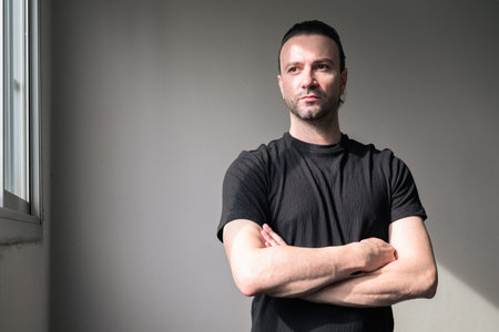A confident man standing upright, with his arms crossed in front of him, showing a strong and assertive posture.