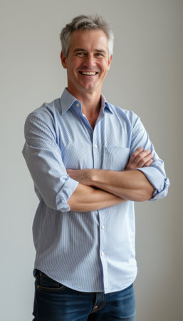 A cheerful middle-aged man stands confidently with his arms crossed, wearing a light blue striped shirt. His warm smile and relaxed posture exude friendliness and approachability, making this image perfect for conveying positivity and professionalism.