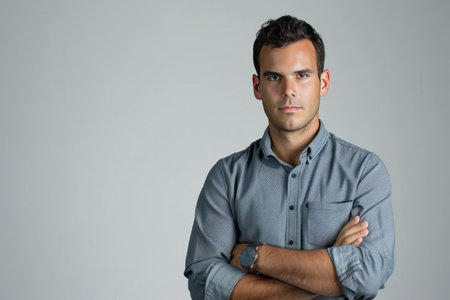 A confident young man stands with his arms crossed, wearing a classic white shirt against a plain background. His expression conveys thoughtfulness and assurance.