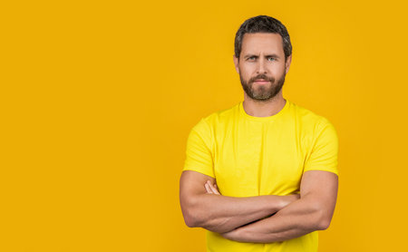 Close up cropped image of mans crossed hands over yellow background