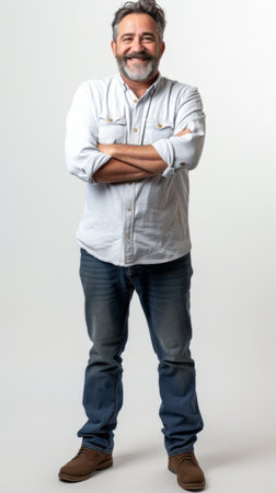 A middle-aged man with gray hair and a beard stands confidently, wearing a white shirt and blue jeans, arms crossed.