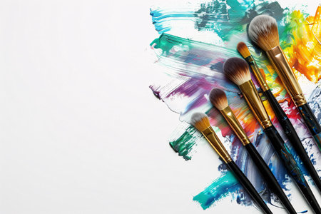 Flat lay with a used artistic tools and place for text on a white background. AI generative