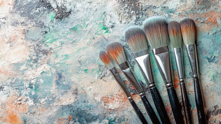 Closeup on paintbrushes on dirty canvas or artists palette covered with oil paints, concept representation for fine art gallery, visual art genius and talented artists workshop. Generative AI