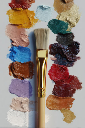 Photorealistic image of a color palette with vibrant paint swatches and a gold brush trophy. The metallic textures and clean white background enhance the artistic composition.