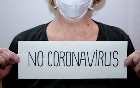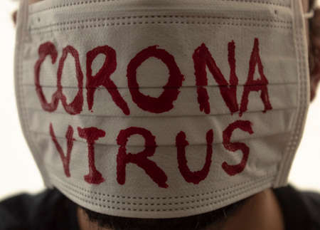 Closed up to a CORONAVIRUS patient using a white face mask with red CORONAVIRUS inscription. Concept photography COVID-2019