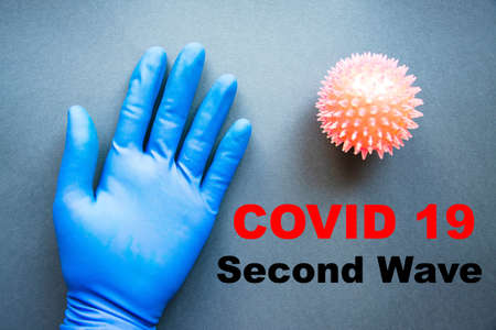 Covid 19 second wave. Covid 19. Blue medical glove and virus on blue, yellow, black background and inscription Covid 19 second wave