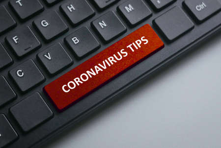 A black keyboard with red button written with Coronavirus Tips as per current situation of Covid-19 pandemic virus outbreak.