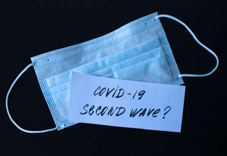 A second wave of coronavirus is expected in the fall and winter. Mask on a black background and a white sheet with the inscription of the second wave of coronavirus