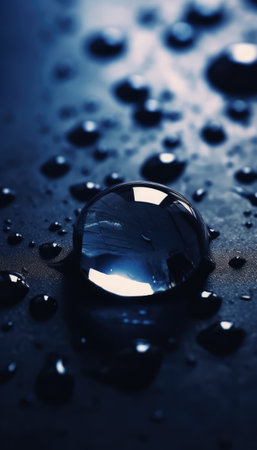 A striking macro captures numerous clear water droplets scattered across a smooth, vibrant blue surface. Each droplet acts like a tiny lens, reflecting light and the surrounding environment, creating miniature worlds within them. Some droplets reveal subtle, colorful refractions, adding a touch of unexpected vibrancy. The varying sizes and the precise focus on the spherical forms highlight the beauty of water in its purest state, showcasing its reflective and refractive properties in...