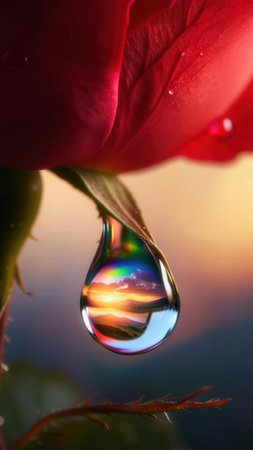 Close-up of a red rose petal with a water droplet reflecting a colorful sunset, symbolizing beauty and nature's harmony.