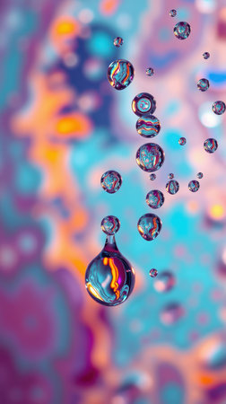 Colorful water droplets cascade through a vibrant abstract background in a stunning display of light and color
