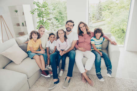 View from bottom of happy large caucasian family with many children making selfie photo at home, parents with kids looking at camera and having fun while taking selfie picture together