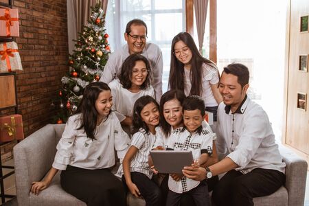asian family using tablet pc together on christmas