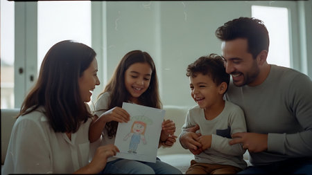 Happy family of four is hugging and smiling while sitting on sofa at home