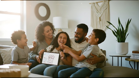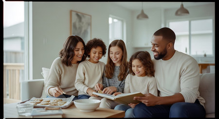 A happy family of five reading together on the couch in a modern living room