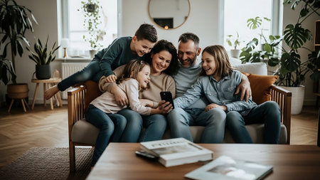 Cheerful family sitting on sofa in living room and using smartphone