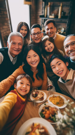 Top view of multigeneration family toasting while having dinner together : Generative AI