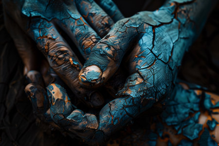 A close-up shot showcases hands adorned with a pattern resembling cracked earth, featuring a blend of teal and earthy tones. The details highlight the passage of time and fragility.