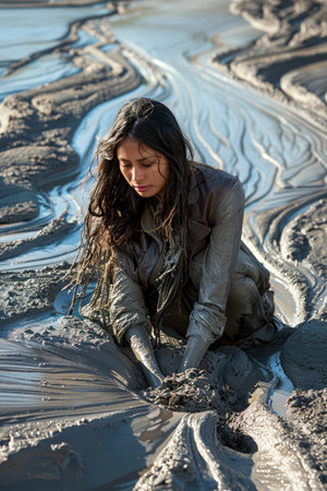 Young Woman Exploring and Touching Wet Mud Patterns in Natural Light, Outdoor Adventure and Nature Exploration AI Generative