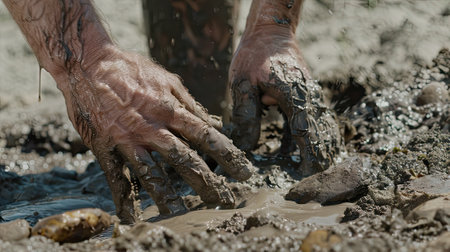 Hand reaching into muddy ground, exploring texture and nature, depicting human interaction with the earth, set against a dark, earthy background, capturing the essence of connection with nature