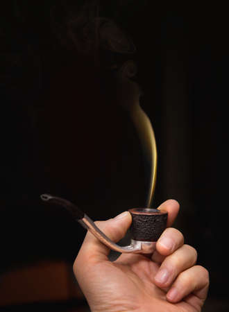 Man’s hand holding pipe with smoke in a dark background. Close up.