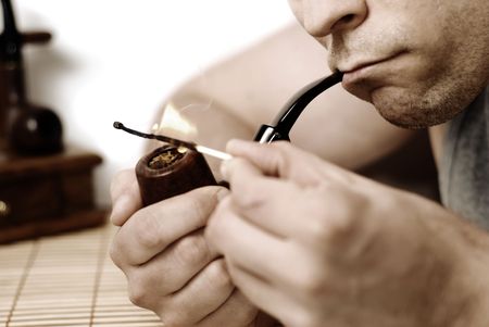 A man lighting a smoking pipe