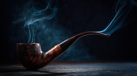 Wooden briar smoking pipe on a dark surface, glowing ember and delicate blue smoke curling into a moody, atmospheric still life evoking ritual, reflection, and vintage calm