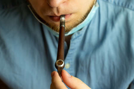 Man holding vintage smoking pipe in hand. Male smoking tobacco.