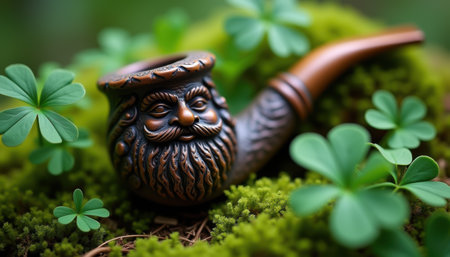 Intricately carved pipe with bearded face on green moss with four-leaf clovers.
