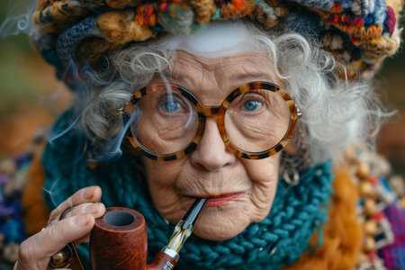 A fashionable elderly woman smokes a pipe on the street in autumn.