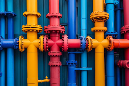 A collection of colorful industrial pipes and fittings arranged artistically against a dark surface, perfect for engineering, construction, or design projects requiring detailed visuals.