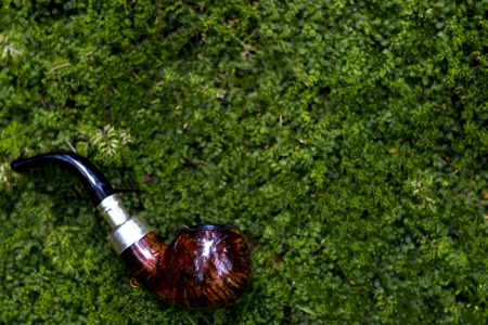tobacco pipe on a green grass background. copy space