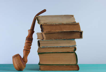 Stack of old books, smoking pipe on wooden shelf against the background of white wall