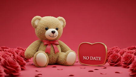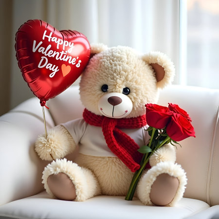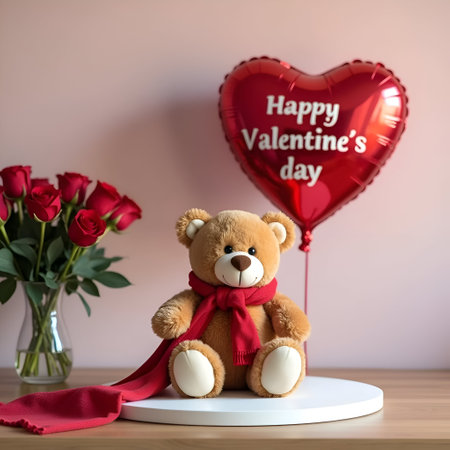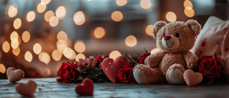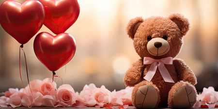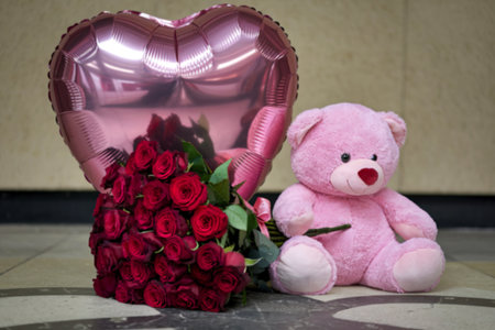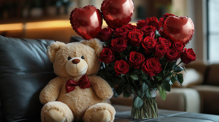 Red roses, teddy bears and heart-shaped balloons create a romantic atmosphere for Valentine's Day celebration