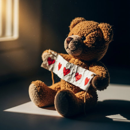 Worn brown teddy bear holding a miniature paper heart banner under harsh cinematic window light.